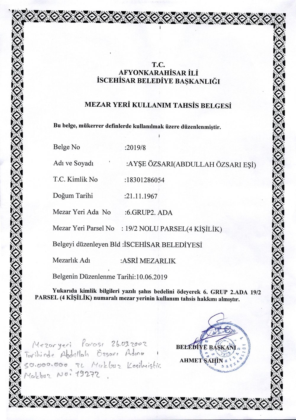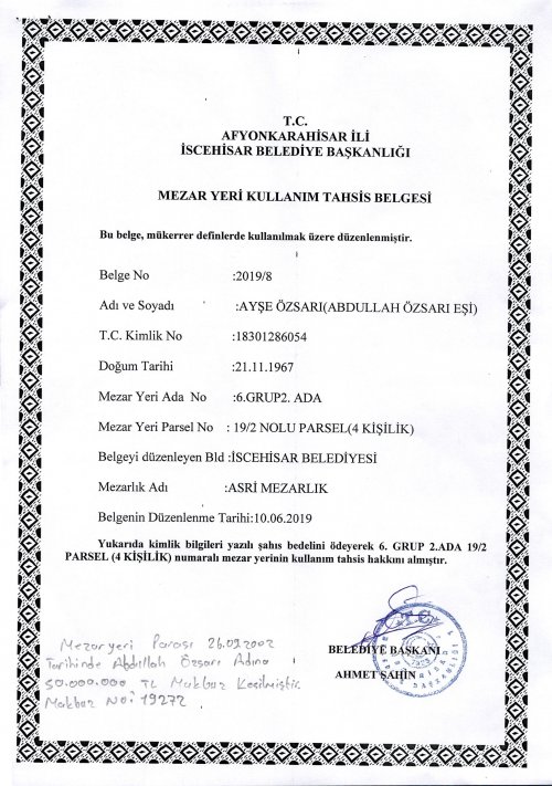 Başkan Şahin; “2002 yılında Abdullah Özsarı adına mezar yeri parası yatırılmış fakat bir türlü yer tahsisi yapılmamıştır. Hak sahibi vatandaşımızın mağduriyetini gidermek adına hummalı bir çalışma sonucu mezar yerini tespit ederek tahsisini yaptık. İnsan odaklı Sosyal Belediyecilik anlayışımızla çalışmalarımıza aralıksız devam edeceğiz.” dedi.