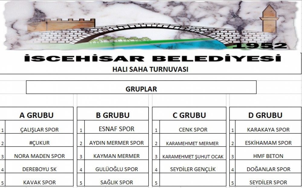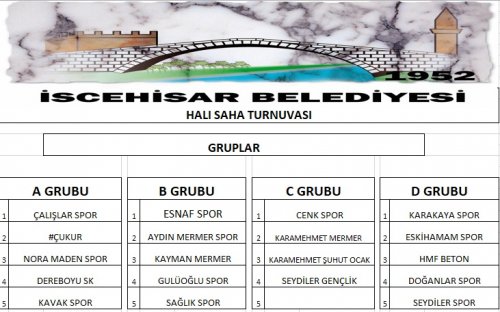 Çekilişte konuşan Belediye Başkanımız Ahmet ŞAHİN; “ İlçemizde uzun zamandır halı saha turnuvası düzenlenmiyor. Gençlerimizin talebini göz önünde bulundurarak Kültür ve Sosyal İşler Müdürlüğümüz organizatörlüğünde turnuva düzenliyoruz. 20 takımın katılımı ile turnuvaya ilgi oldukça yoğun oldu. Benim gözümde hepiniz birincisiniz. Turnuvanın amacı İscehisar ve çevresinde yaşayan sporseverlerimizi bir araya getirerek kaynaştırmak, sporu genci yaşlısı herkese sevdirmektir. İscehisar Belediyesi olarak sosyal kültürel alandaki çalışmalarımız aralıksız devam edecek. Turnuvaya katılan tüm takımlarımıza şimdiden başarılar diliyorum.” dedi. Halı Saha Turnuvası 01.07.2019 pazartesi günü başlayacak. Detaylı bilgi almak isteyen vatandaşlarımız 0542 897 85 73 numaralı telefonu arayabilirler. Kura çekimi sonu gruplar aşağıdaki şekilde oluştu.