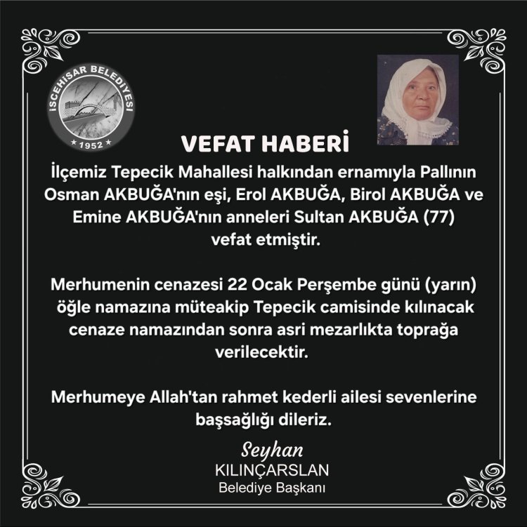 İlçemiz Tepecik Mahallesi halkından ernamıyla Pallının Osman AKBUĞA'nın eşi, Erol AKBUĞA, Birol AKBUĞA ve Emine AKBUĞA'nın anneleri Sultan AKBUĞA (77) vefat etmiştir.