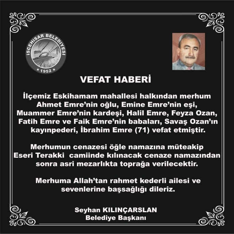 İlçemiz Eskihamam mahallesi halkından merhum Ahmet Emre’nin oğlu, Emine Emre’nin eşi, Muammer Emre’nin kardeşi, Halil Emre, Feyza Ozan, Fatih Emre ve Faik Emre’nin babaları, Savaş Ozan’ın kayınpederi, İbrahim Emre (71) vefat etmiştir.