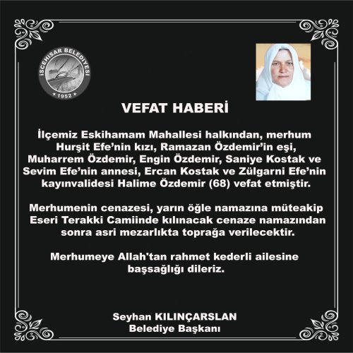 İlçemiz Eskihamam Mahallesi halkından, merhum Hurşit Efe’nin kızı, Ramazan Özdemir’in...