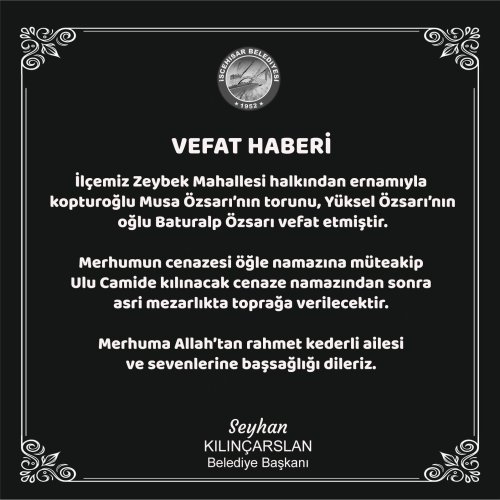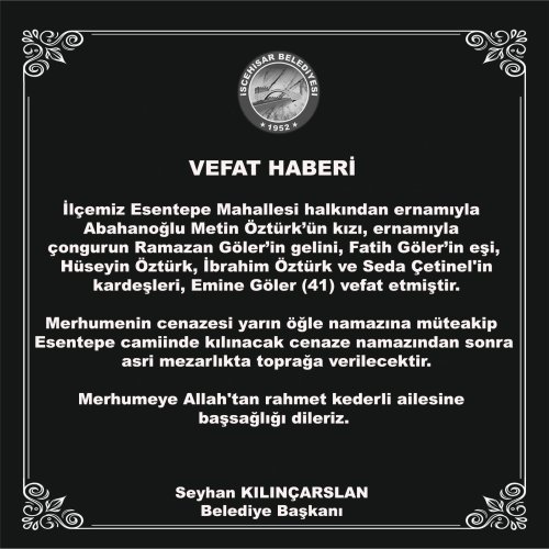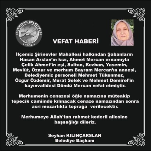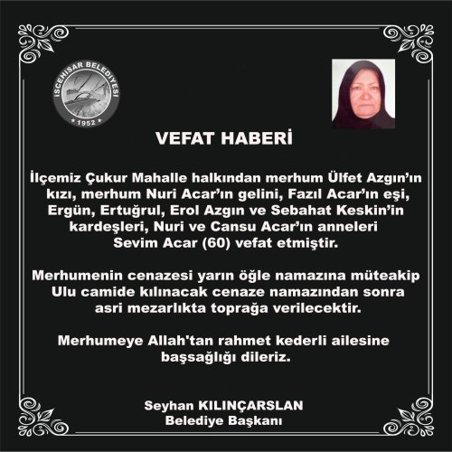 VEFAT HABERİİlçemiz Çukur Mahalle halkından merhum Ülfet Azgın’ın kızı, merhum Nuri...
