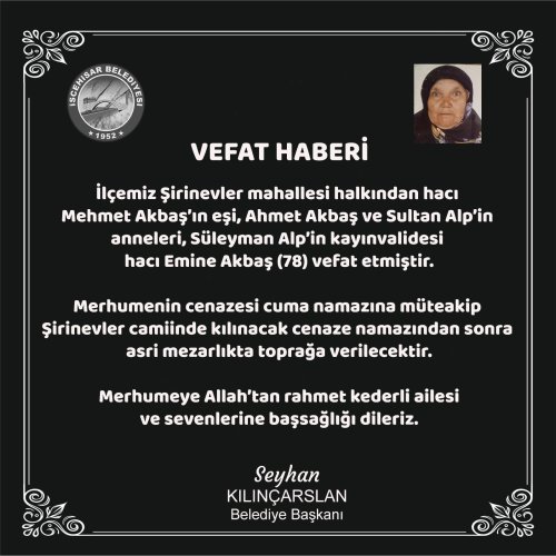İlçemiz Şirinevler mahallesi halkından hacı Mehmet Akbaş’ın eşi, Ahmet Akbaş ve...