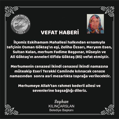 İlçemiz Eskihamam Mahallesi halkından ernamıyla tefçinin Osman Göktaş’ın eşi, Zeliha...