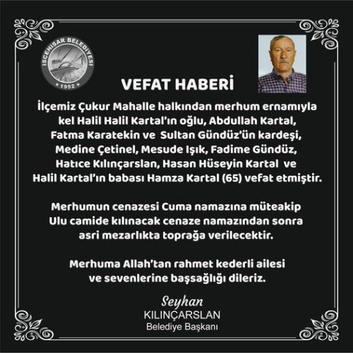 İlçemiz Çukur Mahalle halkından merhum ernamıyla kel Halil Halil Kartal’ın oğlu,...