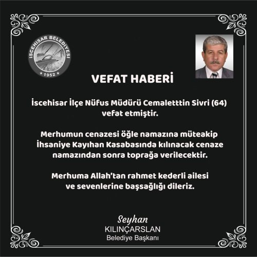 İscehisar İlçe Nüfus Müdürü Cemaletttin Sivri (64) vefat etmiştir.Merhumun cenazesi...