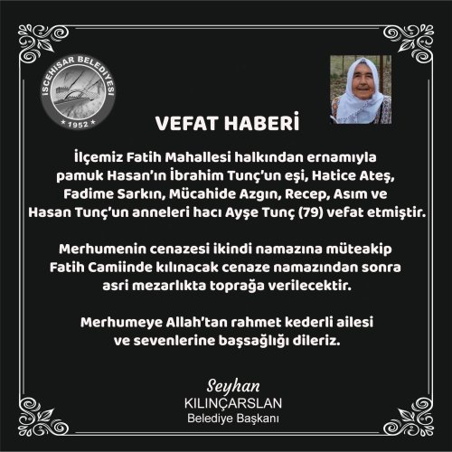 İlçemiz Fatih Mahallesi halkından ernamıyla pamuk Hasan’ın İbrahim Tunç’un eşi,...