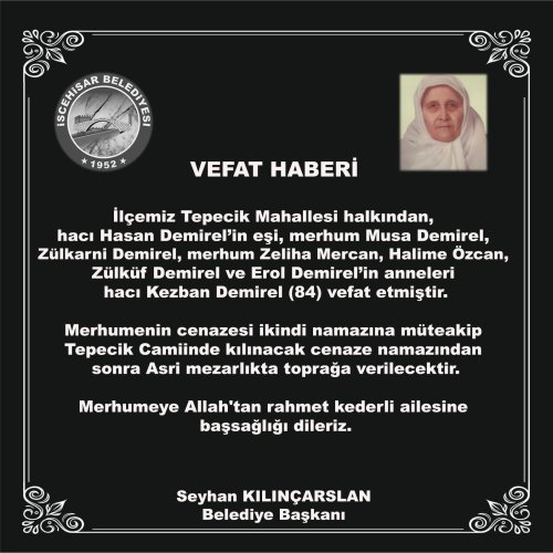 İlçemiz Tepecik Mahallesi halkından, hacı Hasan Demirel’in eşi, merhum Musa Demirel,...