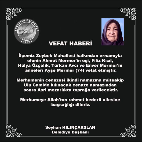 İlçemiz Zeybek Mahallesi halkından ernamıyla efenin Ahmet Mermer'in eşi, Filiz Kızıl,...