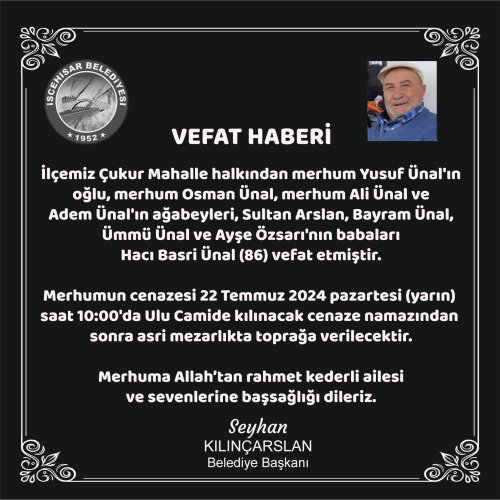İlçemiz Çukur Mahalle halkından merhum Yusuf Ünal'ın oğlu, merhum Osman Ünal, merhum Ali...