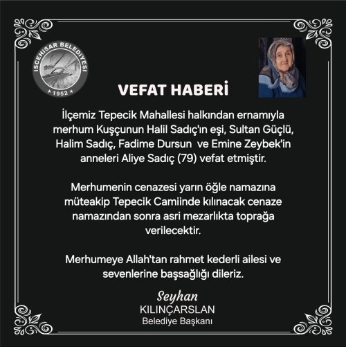 İlçemiz Tepecik Mahallesi halkından ernamıyla merhum Kuşçunun Halil Sadıç'ın eşi,...