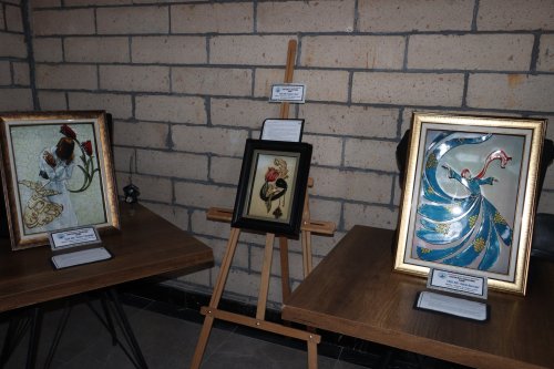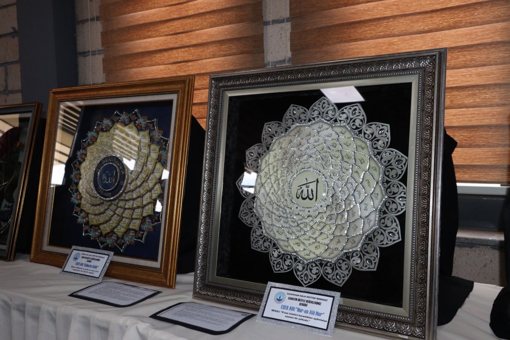 Sergide kursiyerler tarafından rölyef, hat, tezhip, ve ebru sanatıyla hazırlanan eserler sergileniyor.