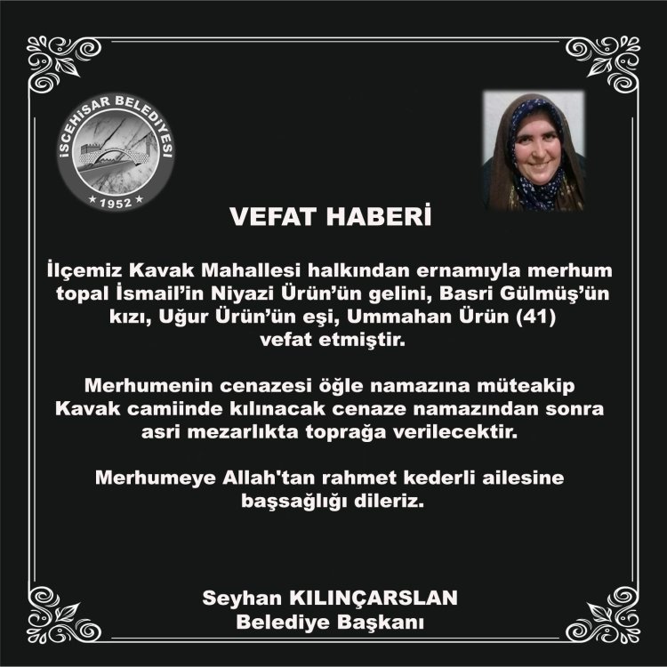İlçemiz Kavak Mahallesi halkından ernamıyla merhum topal İsmail’in Niyazi Ürün’ün gelini, Basri Gülmüş’ün kızı, Uğur Ürün’ün eşi, Ummahan Ürün (41) vefat etmiştir.