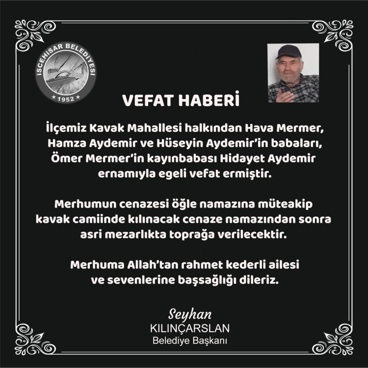 İlçemiz Kavak Mahallesi halkından Hava Mermer, Hamza Aydemir ve Hüseyin Aydemir’in babaları, Ömer Mermer’in kayınbabası Hidayet Aydemir ernamıyla egeli vefat ermiştir.
