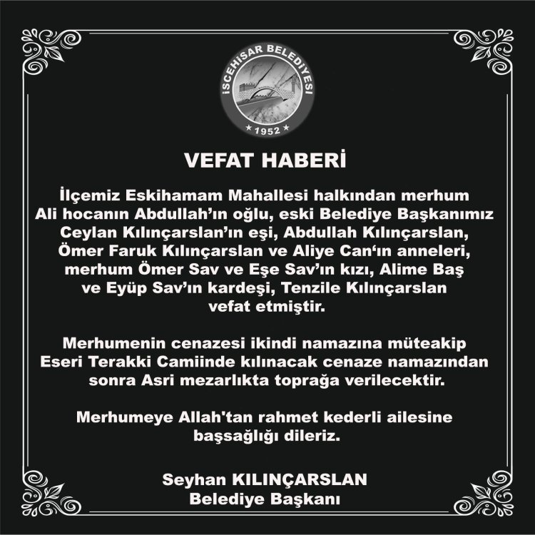 İlçemiz Eskihamam Mahallesi halkından merhum Ali hocanın Abdullah’ın oğlu eski Belediye Başkanımız Ceylan Kılınçarslan’ın eşi, Abdullah Kılınçarslan, Ömer Faruk Kılınçarslan ve Aliye Can‘ın anneleri, merhum Ömer Sav ve Eşe Sav’ın kızı, Alime Baş ve Eyüp Sav’ın kardeşi, Tenzile Kılınçarslan vefat etmiştir.