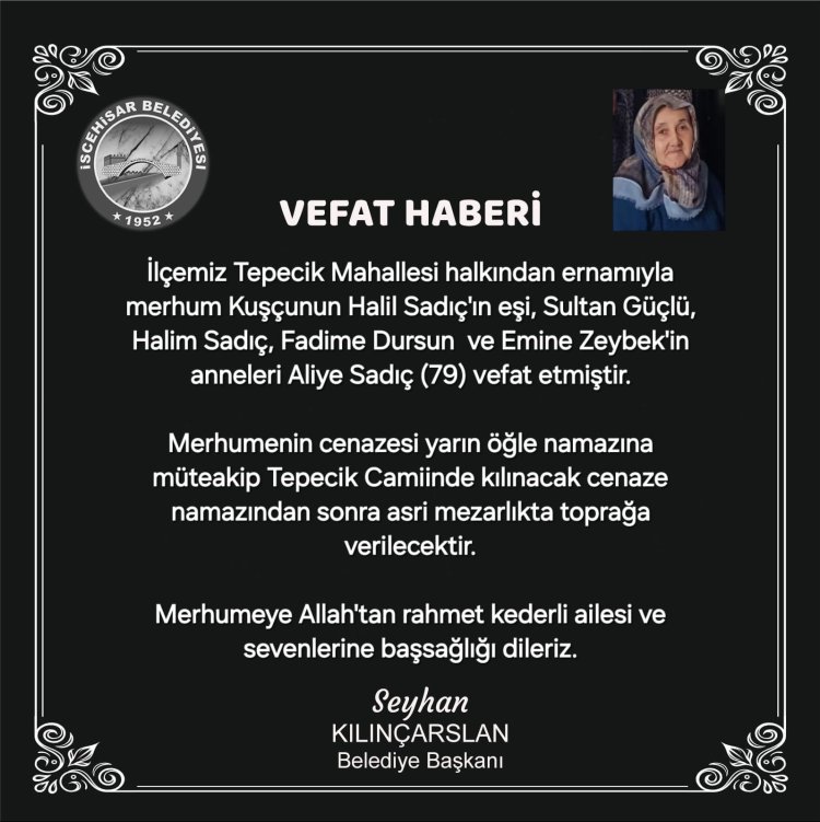 İlçemiz Tepecik Mahallesi halkından ernamıyla merhum Kuşçunun Halil Sadıç'ın eşi, Sultan Güçlü, Halim Sadıç, Fadime Dursun ve Emine Zeybek'in anneleri Aliye Sadıç (79) vefat etmiştir.