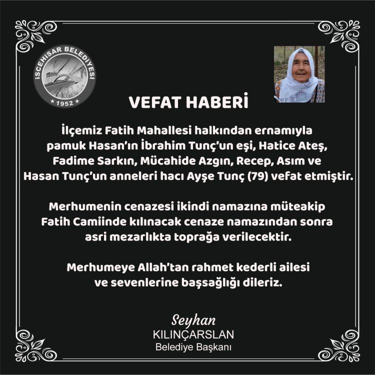 Hasan Tunç’un anneleri hacı Ayşe Tunç (79) vefat etmiştir.