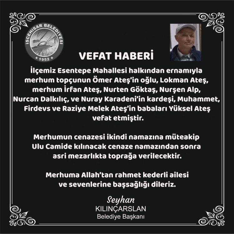 İlçemiz Esentepe Mahallesi halkından ernamıyla merhum topçunun Ömer Ateş’in oğlu, Lokman Ateş, merhum İrfan Ateş, Nurten Göktaş, Nurşen Alp, Nurcan Dalkılıç, ve Nuray Karadeni’in kardeşi, Muhammet, Firdevs ve Raziye Melek Ateş’in babaları Yüksel Ateş vefat etmiştir.