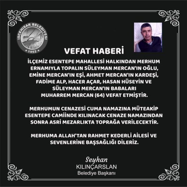 AHMET MERCAN'IN KARDEŞİ, FADİME ALP, HACER AÇAR, HASAN HÜSEYİN VE SÜLEYMAN MERCAN'IN BABALARI MUHARREM MERCAN (64) VEFAT ETMİŞTİR.