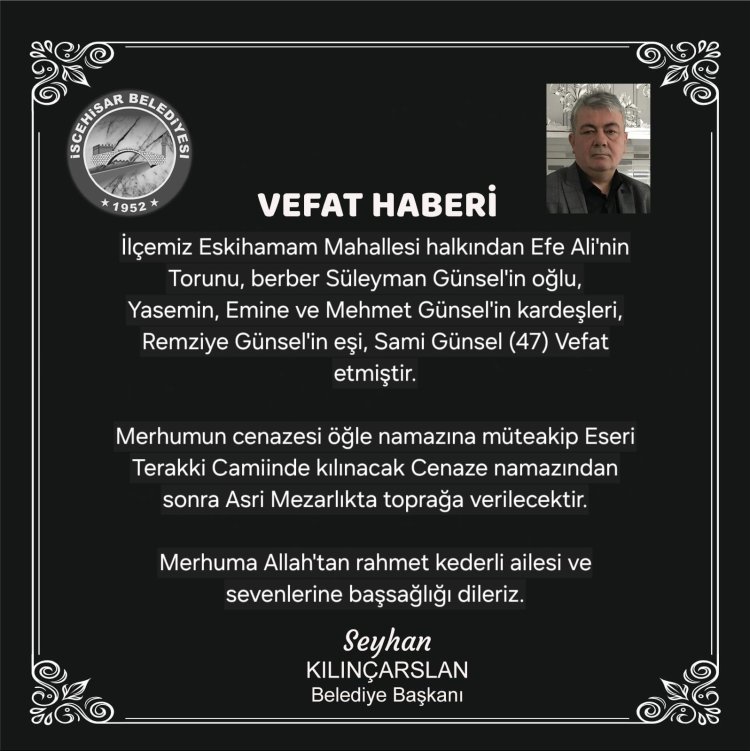 İlçemiz Eskihamam Mahallesi halkından Efe Ali'nin torunu, berber Süleyman Günsel'in oğlu, Yasemin, Emine ve Mehmet Günsel'in kardeşleri, Remziye Günsel'in eşi, Sami Günsel (47) Vefat etmiştir.
