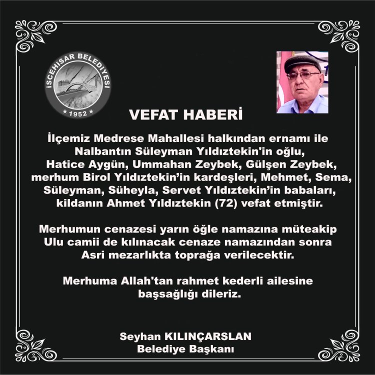 İlçemiz Medrese Mahallesi halkından ernamı ile Nalbantın Süleyman Yıldıztekin'in oğlu, Hatice Aygün, Ummahan Zeybek, Gülşen Zeybek, merhum Birol Yıldıztekin’in kardeşleri, Mehmet, Sema, Süleyman, Süheyla, Servet Yıldıztekin’in babaları, kildanın Ahmet Yıldıztekin (72) vefat etmiştir.