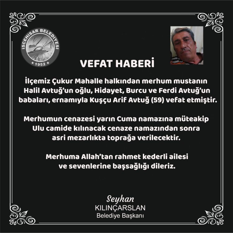İlçemiz Çukur Mahalle halkından merhum mustanın Halil Avtuğ’un oğlu, Hidayet, Burcu ve Ferdi Avtuğ’un babaları, ernamıyla Kuşçu Arif Avtuğ (59) vefat etmiştir.