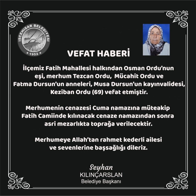 İlçemiz Fatih Mahallesi halkından Osman Ordu’nun eşi, merhum Tezcan Ordu, Mücahit Ordu, ve Fatma Dursun’un anneleri, Musa Dursun’un kayınvalidesi, Keziban Ordu (69) vefat etmiştir.