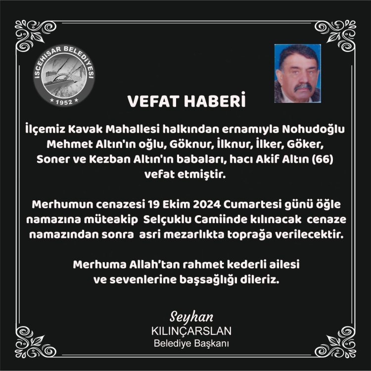 İlçemiz Kavak Mahallesi halkından ernamıyla Nohudoğlu Mehmet Altın'ın oğlu, Göknur, İlknur, İlker, Göker, Soner ve Kezban Altın'ın babaları, hacı Akif Altın (66) vefat etmiştir.