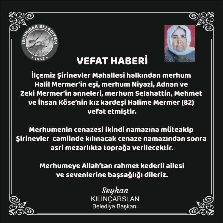 İlçemiz Şirinevler Mahallesi halkından merhum Halil Mermer’in eşi, merhum Niyazi, Adnan ve Zeki Mermer’in anneleri, merhum Selahattin, Mehmet ve İhsan Köse’nin kız kardeşi Halime Mermer (82) vefat etmiştir.