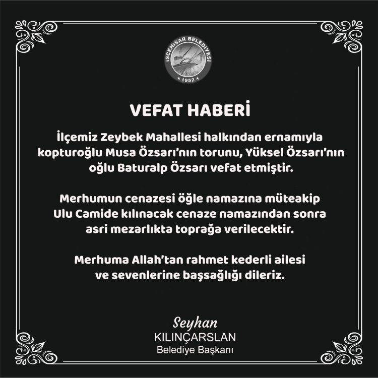 İlçemiz Zeybek Mahallesi halkından ernamıyla kopturoğlu Musa Özsarı’nın torunu, Yüksel Özsarı’nın oğlu Baturalp Özsarı vefat etmiştir.