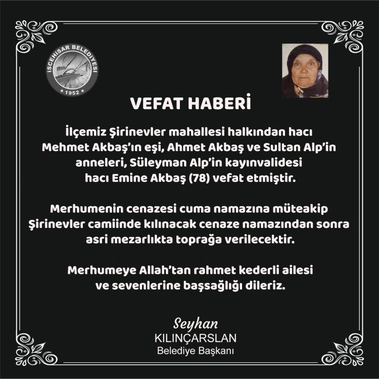İlçemiz Şirinevler mahallesi halkından hacı Mehmet Akbaş’ın eşi, Ahmet Akbaş ve Sultan Alp’in anneleri, Süleyman Alp’in kayınvalidesi hacı Emine Akbaş (78) vefat etmiştir.