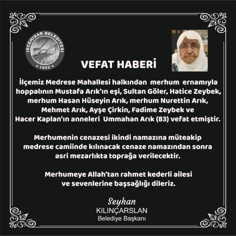 İlçemiz Medrese Mahallesi halkından merhum ernamıyla hoppalının Mustafa Arık’ın eşi, Sultan Göler, Hatice Zeybek, merhum Hasan Hüseyin Arık, merhum Nurettin Arık, Mehmet Arık, Ayşe Çirkin, Fadime Zeybek ve Hacer Kaplan’ın anneleri Ummahan Arık (83) vefat etmiştir.