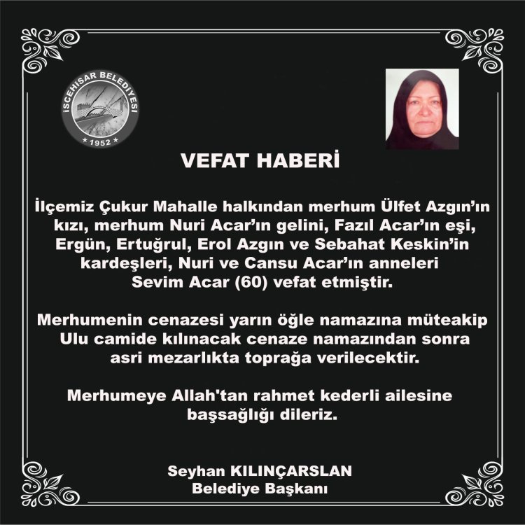 İlçemiz Çukur Mahalle halkından merhum Ülfet Azgın’ın kızı, merhum Nuri Acar’ın gelini, Fazıl Acar’ın eşi, Ergün, Ertuğrul, Erol Azgın ve Sebahat Keskin’in kardeşleri, Nuri ve Cansu Acar’ın anneleri Sevim Acar (60) vefat etmiştir.