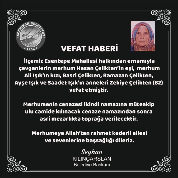 İlçemiz Esentepe Mahallesi halkından ernamıyla çevgenlerin merhum Hasan Çelikten’in eşi, merhum Ali Işık’ın kızı, Basri Çelikten, Ramazan Çelikten, Ayşe Işık ve Saadet Işık’ın anneleri Zekiye Çelikten (82) vefat etmiştir.