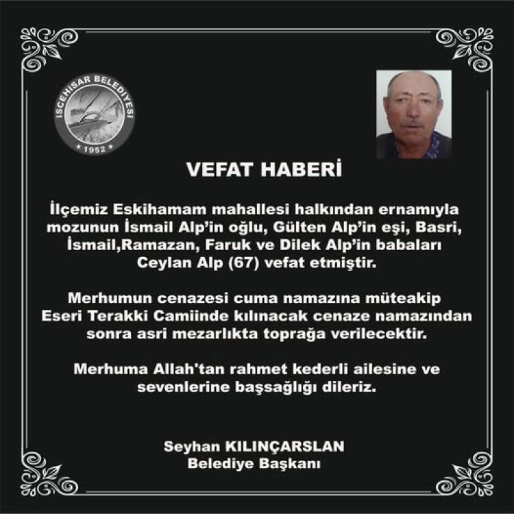 İlçemiz Eskihamam mahallesi halkından ernamıyla mozunun İsmail Alp’in oğlu, Gülten Alp’in eşi, Basri, İsmail, Ramazan, Faruk ve Dilek Alp’in babaları Ceylan Alp (67) vefat etmiştir.