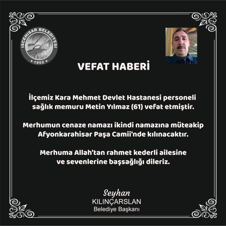 İlçemiz Kara Mehmet Devlet Hastanesi personeli sağlık memuru Metin Yılmaz (61) vefat etmiştir.