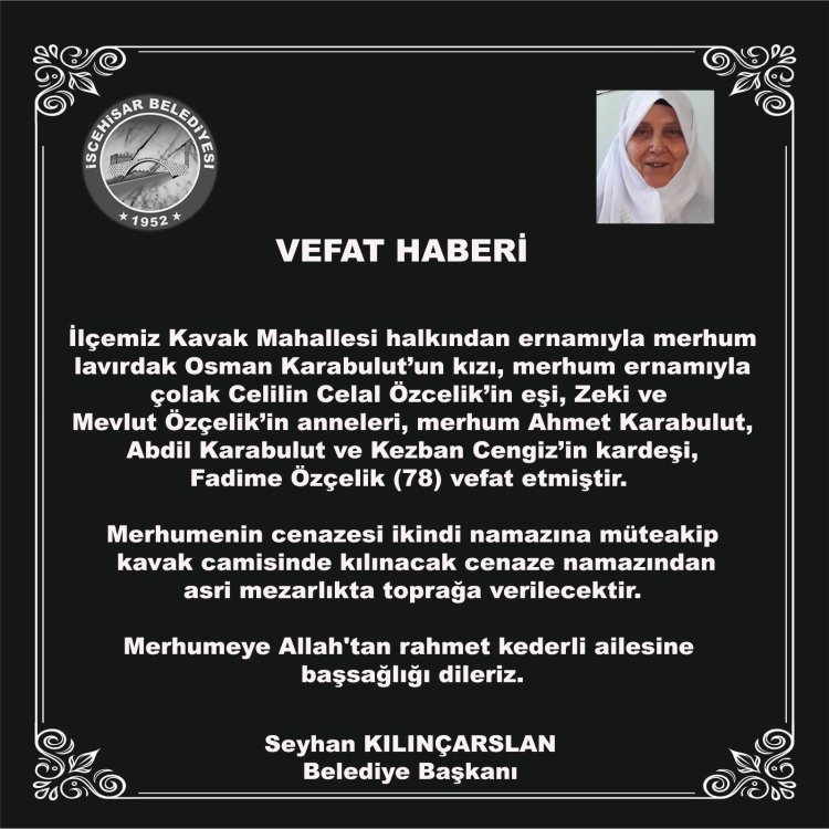İlçemiz Kavak Mahallesi halkından ernamıyla merhum lavırdak Osman Karabulut’un kızı, merhum ernamıyla çolak Celilin Celal Özcelik’in eşi, Zeki ve Mevlut Özçelik’in anneleri, merhum Ahmet Karabulut, Abdil Karabulut ve Kezban Cengiz’in kardeşi, Fadime Özçelik vefat etmiştir.
