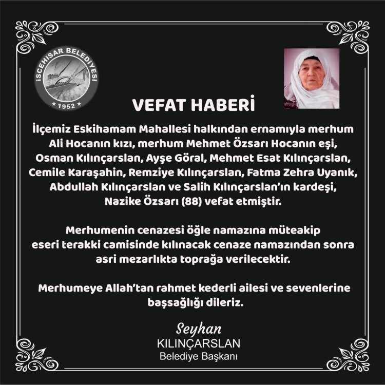 İlçemiz Eskihamam Mahallesi halkından ernamıyla merhum Ali Hocanın kızı, merhum Mehmet Özsarı Hocanın eşi, Osman Kılınçarslan, Ayşe Göral, Mehmet Esat Kılınçarslan, Cemile Karaşahin, Remziye Kılınçarslan, Fatma Zehra Uyanık, Abdullah Kılınçarslan ve Salih Kılınçarslan’ın kardeşi, Nazike Özsarı (88) vefat etmiştir.