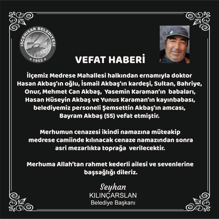 İlçemiz Medrese Mahallesi halkından ernamıyla doktor Hasan Akbaş’ın oğlu, İsmail Akbaş’ın kardeşi, Sultan, Bahriye, Onur, Mehmet Can Akbaş, Yasemin Karaman’ın babaları, Hasan Hüseyin Akbaş ve Yunus Karaman’ın kayınbabası, belediyemiz personeli Şemsettin Akbaş’ın amcası, Bayram Akbaş (55) vefat etmiştir.