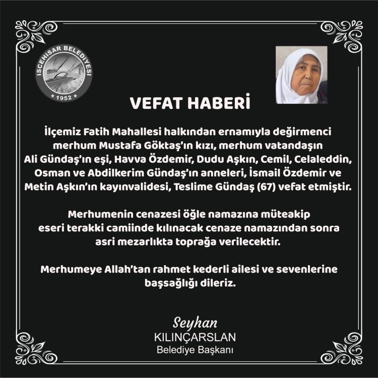 Merhumenin cenazesi öğle namazına müteakip eseri terakki camiinde kılınacak cenaze namazından sonra asri mezarlıkta toprağa verilecektir.