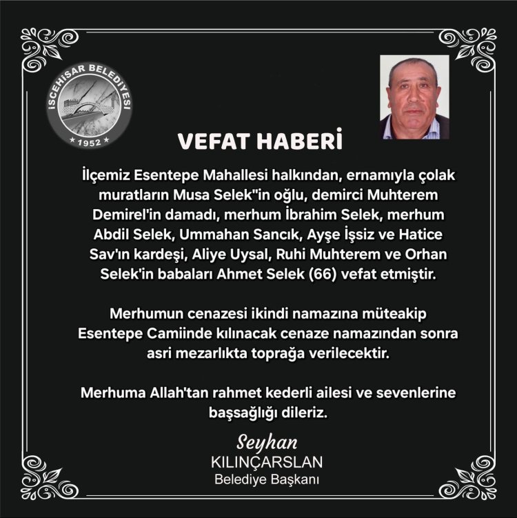 İlçemiz Esentepe Mahallesi halkından, ernamıyla çolak muratların Musa Selek''in oğlu, demirci Muhterem Demirel'in damadı, merhum İbrahim Selek, merhum Abdil Selek, Ummahan Sancık, Ayşe İşsiz ve Hatice Sav'ın kardeşi, Aliye Uysal, Ruhi Muhterem ve Orhan Selek'in babaları Ahmet Selek (66) vefat etmiştir.