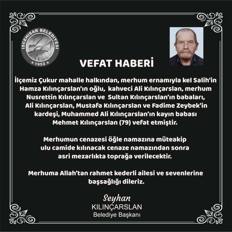 İlçemiz Çukur mahalle halkından, merhum ernamıyla kel Salih’in Hamza Kılınçarslan’ın oğlu, kahveci Ali Kılınçarslan, merhum Nusrettin Kılınçarslan ve Sultan Kılınçarslan’ın babaları, Ali Kılınçarslan, Mustafa Kılınçarslan ve Fadime Zeybek’in kardeşi, Muhammed Ali Kılınçarslan’ın kayın babası Mehmet Kılınçarslan (79) vefat etmiştir.