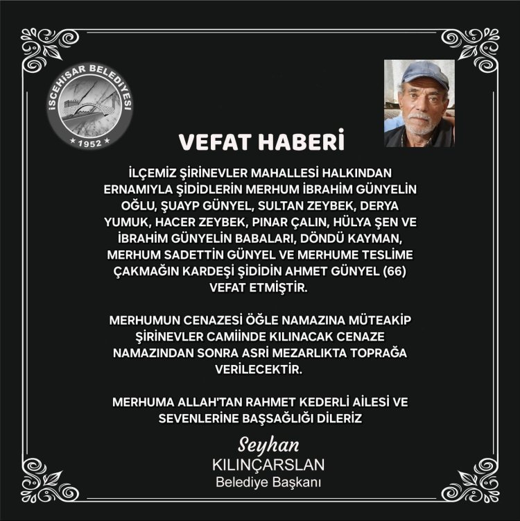 İLÇEMİZ ŞİRİNEVLER MAHALLESİ HALKINDAN ERNAMIYLA ŞİDİDLERİN MERHUM İBRAHİM GÜNYELİN OĞLU, ŞUAYP GÜNYEL, SULTAN ZEYBEK, DERYA YUMUK, HACER ZEYBEK, PINAR ÇALIN, HÜLYA ŞEN VE İBRAHİM GÜNYELİN BABALARI, DÖNDÜ KAYMAN, MERHUM SADETTİN GÜNYEL VE MERHUME TESLİME ÇAKMAĞIN KARDEŞİ ŞİDİDİN AHMET GÜNYEL (66) VEFAT ETMİŞTİR.