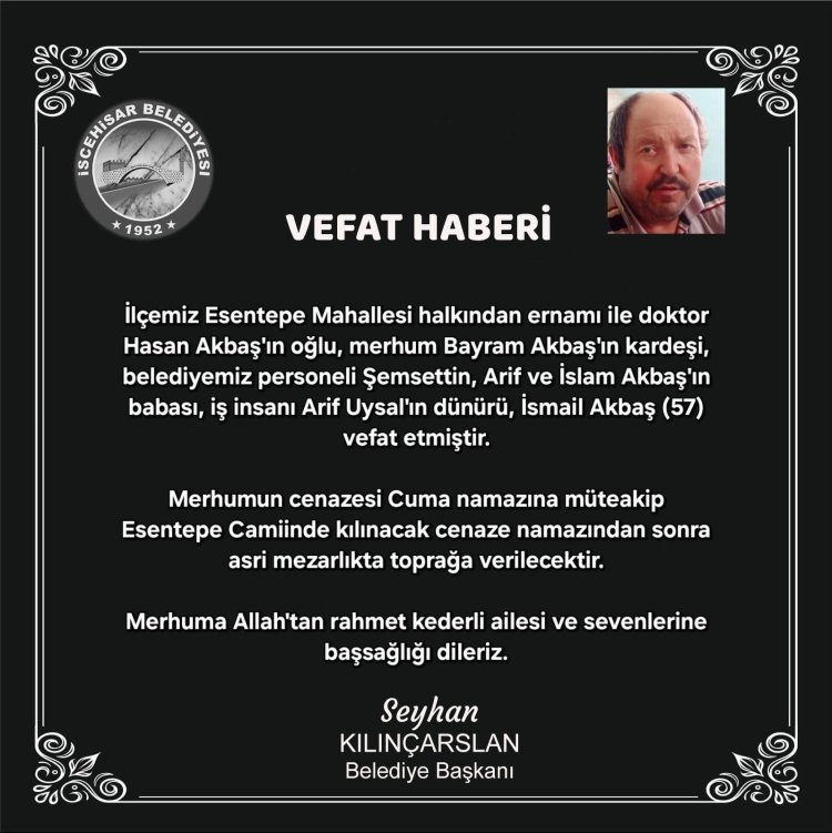 İlçemiz Esentepe Mahallesi halkından ernamı ile doktor Hasan Akbaş'ın oğlu, merhum Bayram Akbaş'ın kardeşi, belediyemiz personeli Şemsettin, Arif ve İslam Akbaş'ın babası, iş insanı Arif Uysal'ın dünürü, İsmail Akbaş (57) vefat etmiştir.
