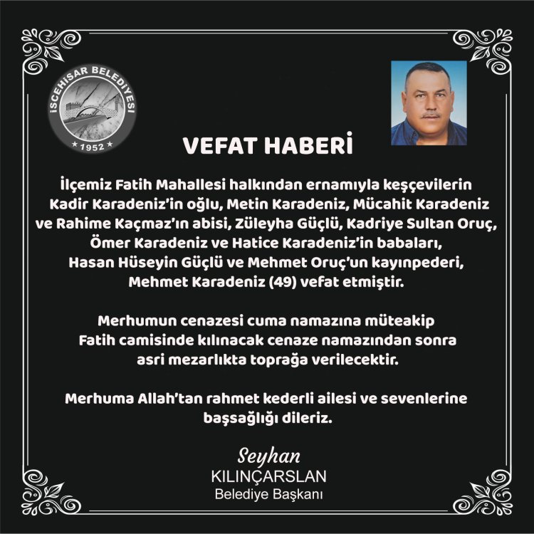 İlçemiz Fatih Mahallesi halkından ernamıyla keşçevilerin Kadir Karadeniz’in oğlu, Metin Karadeniz, Mücahit Karadeniz ve Rahime Kaçmaz’ın abisi, Züleyha Güçlü, Kadriye Sultan Oruç, Ömer Karadeniz ve Hatice Karadeniz’in babaları, Hasan Hüseyin Güçlü ve Mehmet Oruç’un kayınpederi, Mehmet Karadeniz (49) vefat etmiştir.