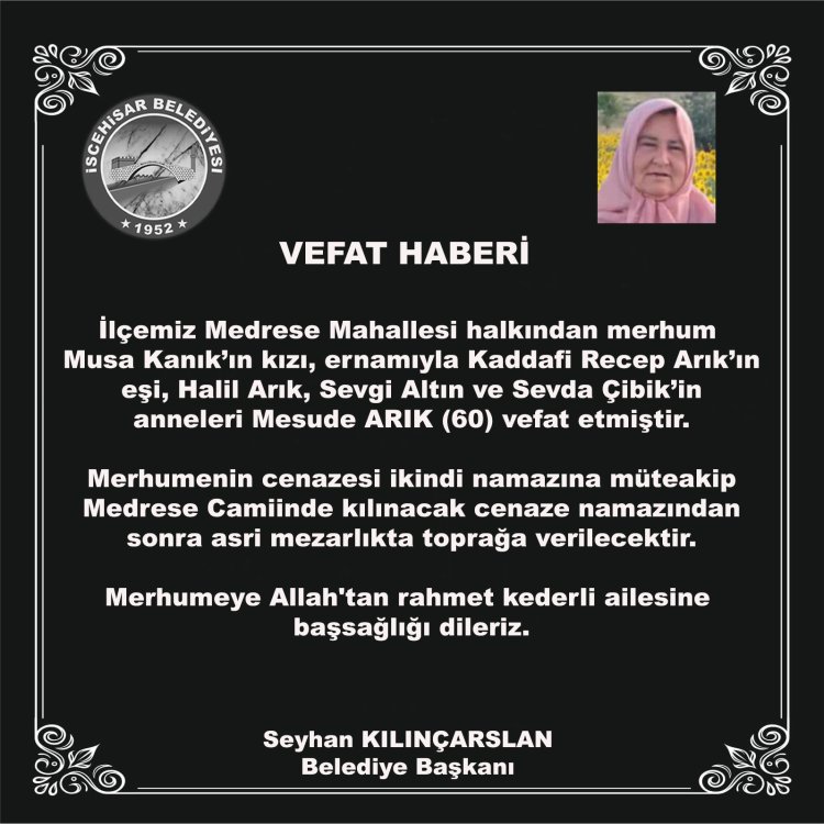 İlçemiz Medrese Mahallesi halkından merhum Musa Kanık’ın kızı, ernamıyla Kaddafi Recep Arık’ın eşi, Halil Arık, Sevgi Altın ve Sevda Çibik’in anneleri Mesude ARIK (60) vefat etmiştir.