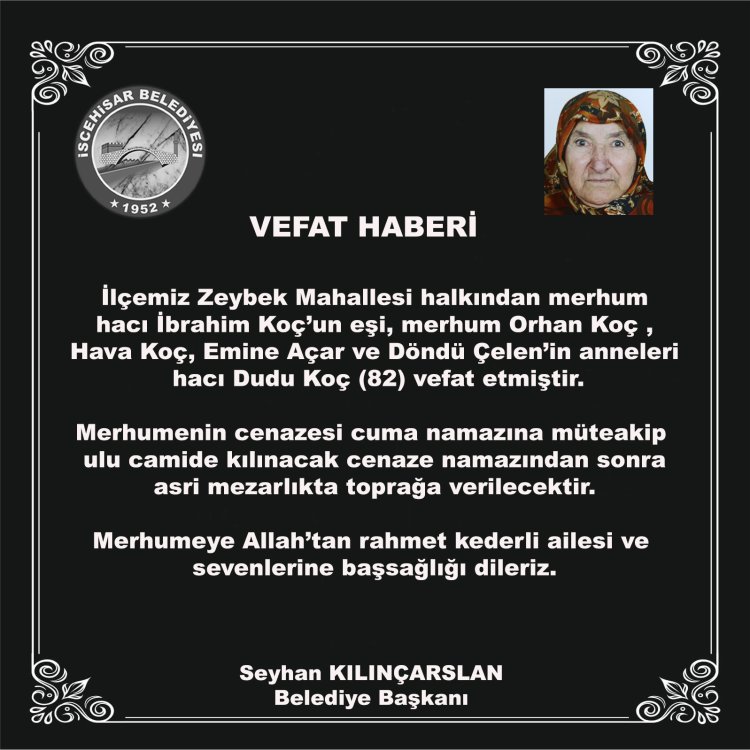 İlçemiz Zeybek Mahallesi halkından merhum hacı İbrahim Koç’un eşi, merhum Orhan Koç , Hava Koç, Emine Açar ve Döndü Çelen’in anneleri hacı Dudu Koç (82) vefat etmiştir.