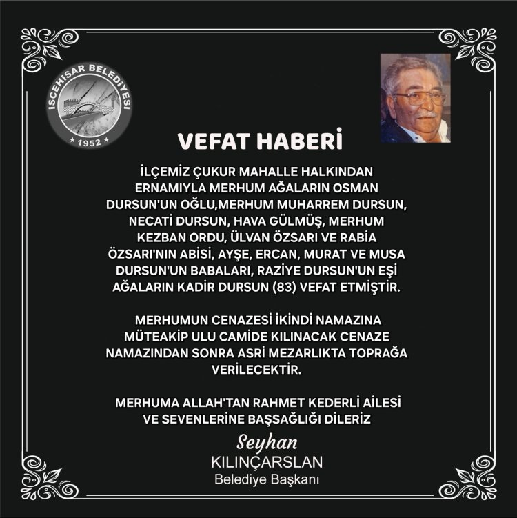 İLÇEMİZ ÇUKUR MAHALLE HALKINDAN ERNAMIYLA MERHUM AĞALARIN OSMAN DURSUN'UN OĞLU, MERHUM MUHARREM DURSUN NECATİ DURSUN, HAVA GÜLMÜŞ, MERHUM KEZBAN ORDU, ÜLVAN ÖZSARI VE RABİA ÖZSARI'NIN ABİSİ, AYŞE, ERCAN, MURAT VE MUSA DURSUN'UN BABALARI, RAZİYE DURSUN'UN EŞİ AĞALARIN KADİR DURSUN (83) VEFAT ETMİŞTİR.