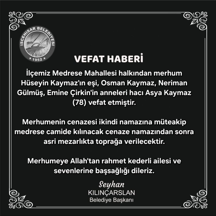 Merhumenin cenazesi ikindi namazına müteakip medrese camide kılınacak cenaze namazından sonra asri mezarlıkta toprağa verilecektir.