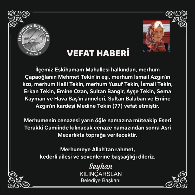 merhum İsmail Azgın’ın kızı, merhum Halil Tekin, merhum Yusuf Tekin, İsmail Tekin, Erkan Tekin, Emine Ozan, Sultan Bangir, Ayşe Tekin, Sema Kayman ve Hava Baş’ın anneleri, Sultan Balaban ve Emine Azgın’ın kardeşi, Medine Tekin (77) vefat etmiştir.